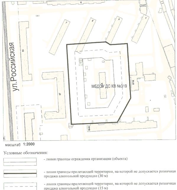 СХЕМА ГРАНИЦ ТЕРРИТОРИИ, НА КОТОРОЙ НЕ ДОПУСКАЕТСЯ РОЗНИЧНАЯ ПРОДАЖА АЛКОГОЛЬНОЙ ПРОДУКЦИИ, ПРИЛЕГАЮЩЕЙ К МБДОУ ДС КВ N 319 ПО АДРЕСУ: Г. ЧЕЛЯБИНСК, КАЛИНИНСКИЙ РАЙОН, УЛ. РОССИЙСКАЯ, 57-А.