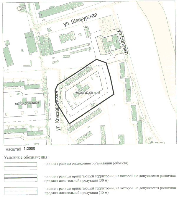 СХЕМА ГРАНИЦ ТЕРРИТОРИИ, НА КОТОРОЙ НЕ ДОПУСКАЕТСЯ РОЗНИЧНАЯ ПРОДАЖА АЛКОГОЛЬНОЙ ПРОДУКЦИИ, ПРИЛЕГАЮЩЕЙ К МБДОУ ДС ОВ N 161, ПО АДРЕСУ: Г. ЧЕЛЯБИНСК, КАЛИНИНСКИЙ РАЙОН, УЛ. ШЕНКУРСКАЯ, 3-А.