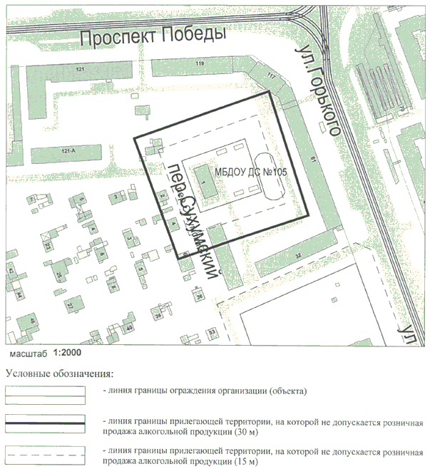 СХЕМА ГРАНИЦ ТЕРРИТОРИИ, НА КОТОРОЙ НЕ ДОПУСКАЕТСЯ РОЗНИЧНАЯ ПРОДАЖА АЛКОГОЛЬНОЙ ПРОДУКЦИИ, ПРИЛЕГАЮЩЕЙ К МБДОУ ДС N 105, ПО АДРЕСУ: Г. ЧЕЛЯБИНСК, КАЛИНИНСКИЙ РАЙОН, УЛ. СУХУМСКИЙ ПЕРЕУЛОК, 1.