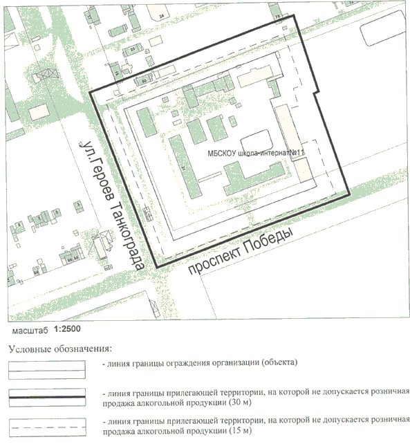 СХЕМА ГРАНИЦ ТЕРРИТОРИИ, НА КОТОРОЙ НЕ ДОПУСКАЕТСЯ РОЗНИЧНАЯ ПРОДАЖА АЛКОГОЛЬНОЙ ПРОДУКЦИИ, ПРИЛЕГАЮЩЕЙ К МБСКОУ ШКОЛА ИНТЕРНАТ N 11 ПО АДРЕСУ: Г. ЧЕЛЯБИНСК, КАЛИНИНСКИЙ РАЙОН, УЛ. ГЕРОЕВ ТАНКОГРАДА, 21.