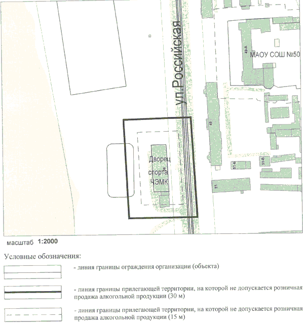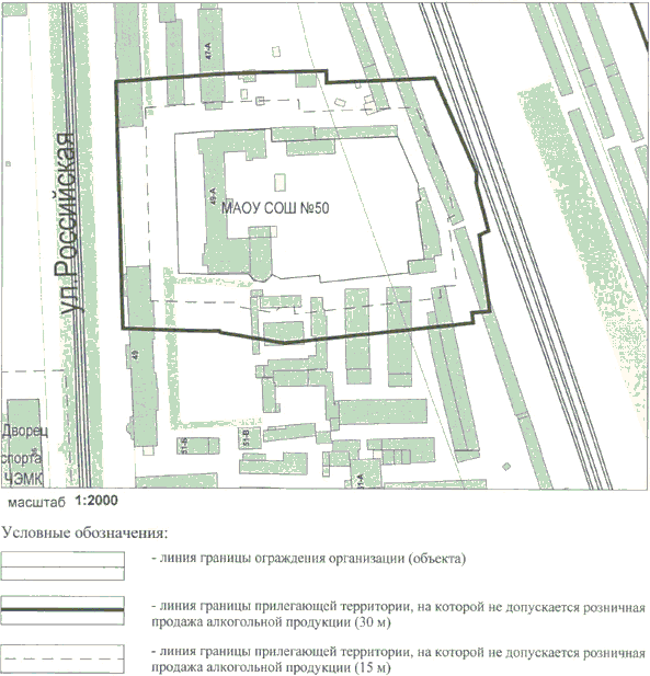 СХЕМА ГРАНИЦ ТЕРРИТОРИИ, НА КОТОРОЙ НЕ ДОПУСКАЕТСЯ РОЗНИЧНАЯ ПРОДАЖА АЛКОГОЛЬНОЙ ПРОДУКЦИИ, ПРИЛЕГАЮЩЕЙ К МАОУ СОШ N 50 ПО АДРЕСУ: Г. ЧЕЛЯБИНСК, КАЛИНИНСКИЙ РАЙОН,УЛ. РОССИЙСКАЯ,49-А.