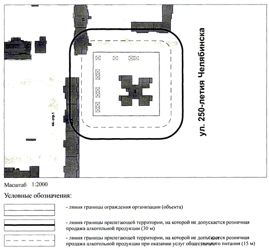 СХЕМА ГРАНИЦ ТЕРРИТОРИИ, НА КОТОРОЙ НЕ ДОПУСКАЕТСЯ РОЗНИЧНАЯ ПРОДАЖА АЛКОГОЛЬНОЙ ПРОДУКЦИИ, ПРИЛЕГАЮЩЕЙ К МАОУ "ОЦ "НЬЮТОН" ПО АДРЕСУ: Г. ЧЕЛЯБИНСК, КАЛИНИНСКИЙ РАЙОН, УЛ. 250-ЛЕТИЯ ЧЕЛЯБИНСКА, 44.