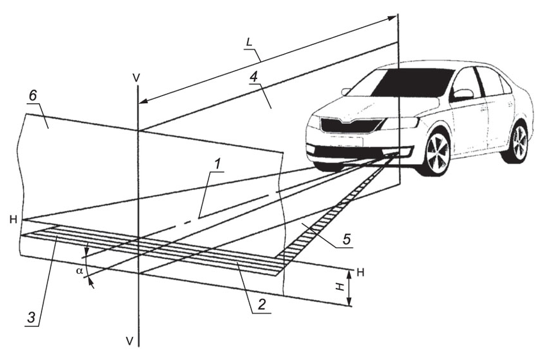 2.34 оптическая ось прибора для проверки и регулировки фар: Линия, проходящая через центр объектива прибора и точку пересечения осей V и H на экране, встроенном в прибор для проверки и регулировки фар.