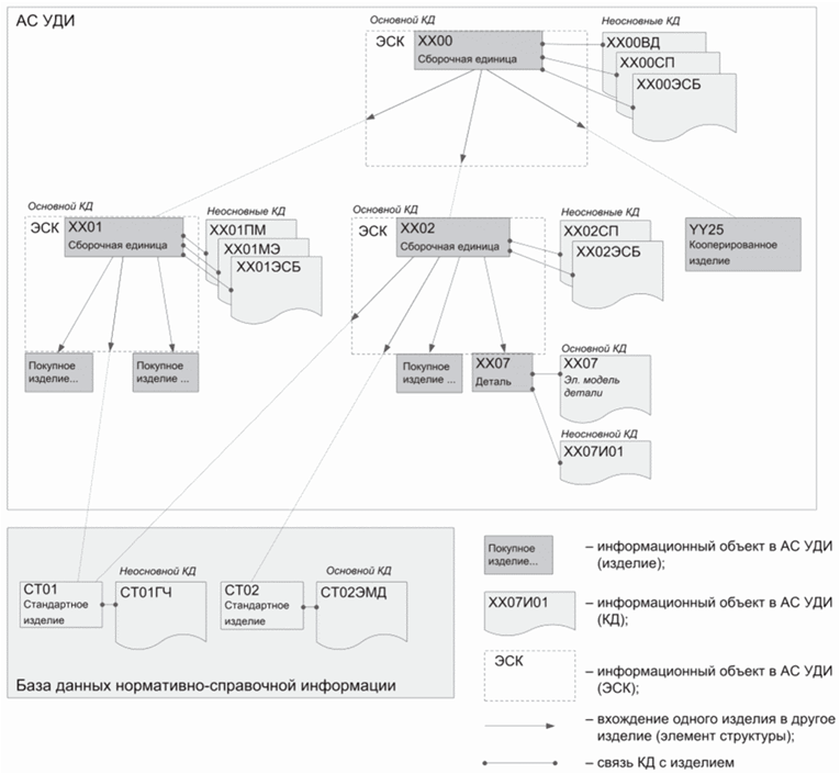 2. ЭСК содержит только ссылки на другие КД: электронные модели сборочных единиц, электронные модели деталей, странично-ориентированные электронные документы (спецификации, ведомости, чертежи, инструкции, программы и методики испытаний и т.д.), а также ЭСК содержит ссылки на элементы базы данных нормативно-справочной информации.