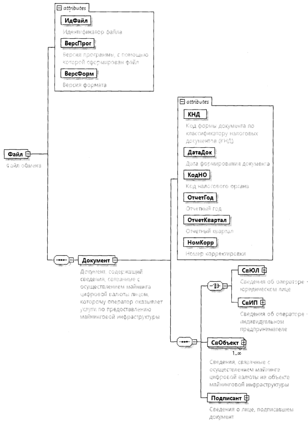 | Сведения, связанные с осуществлением майнинга цифровой валюты на объекте майнинговой инфраструктуры | СвОбъект | С | | ОМ | Состав элемента представлен в таблице 4.5 |
