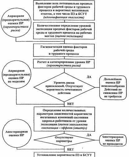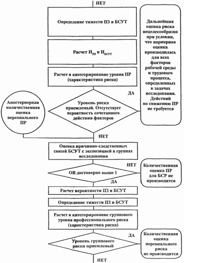 Количественная оценка ПР проводится в случае установления достоверной причинно-следственной связи негативных ответов с экспозицией факторов рабочей среды и трудового процесса. Целью количественной оценки ПР, обусловленного развитием ПЗ и БСУТ, является установление уровней риска, категорирование уровней риска и оценка их приемлемости. На этапе оценки апостериорного ПР для отдельных профессий устанавливается вероятность формирования профессиональной непригодности.