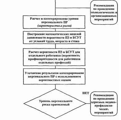 - установления уровня ПР, категорирования, оценки его приемлемости и формирования групп ПР, обусловленного развитием профессиональных заболеваний (далее - ПЗ) и болезней, связанных с условиями труда, с учетом вероятности развития профессиональной непригодности, для разработки рекомендаций по управленческим решениям, направленным на снижение уровня ПР.