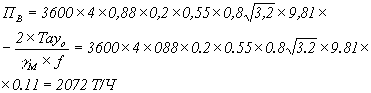 П = К_п х (0,9В - 0,05)(в ст.2) х V x гамма х К_бета = 470 х (0,90,63 - 0,05)(в ст.2) х 2 х 1,03 х 0,97 = 254 т/ч.