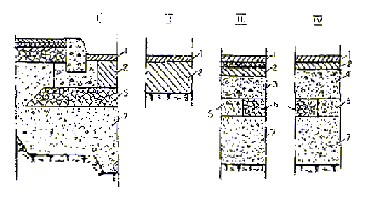 1 - высокоплотный, плотный асфальтобетон; 2 - плотный, пористый асфальтобетон; 3 - тощий (укатываемый бетон марки 75,100); 4 - пластичный цементобетон марки 200, 300; 5, 6 - технологический слой (щебеночные и гравийные материалы с обработкой или без обработки вяжущими; цементопесчаные смеси); 7 - песчаный подстилающий слой