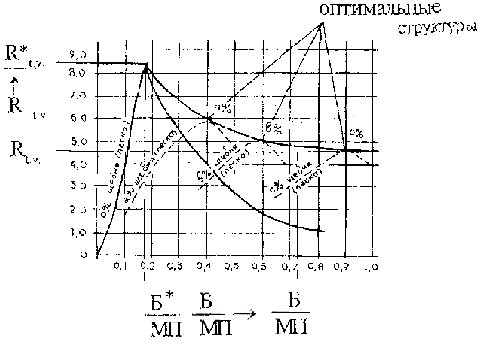 Характерные зависимости в системе координат (R_tv - Б/МП) при оптимальных и неоптимальных структурах асфальтобетона