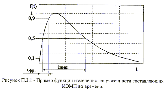 f(t) - функция изменения напряженности составляющих ЭМП во времени, составляющая для 10%, 50% и 90% максимального амплитудного значения соответственно 0,1; 0,5 и 0,9 (рисунок П.3.1).