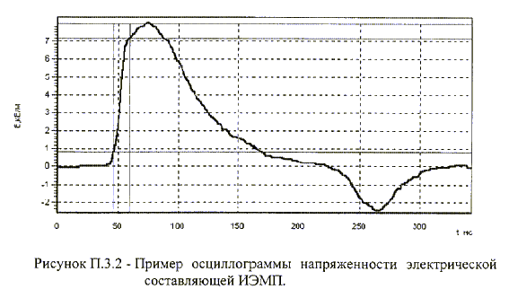 1. Для определения амплитудно-временных параметров ИЭМП производится анализ графического изображения импульса (осциллограммы напряженности электрической или магнитной составляющей ИЭМП), полученного в результате проведенных измерений с использованием осциллографа (см. рисунок П.3.1).