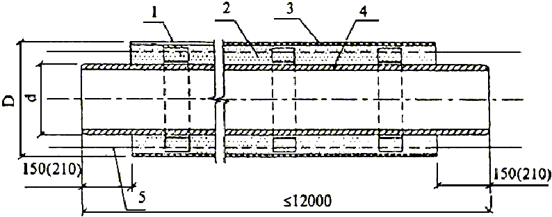 5.1.11 Тепловую изоляцию наносят на всю длину стальных труб и фасонных изделий за исключением концевых участком, равных 150 мм при диаметре труб до 219 мм и 210