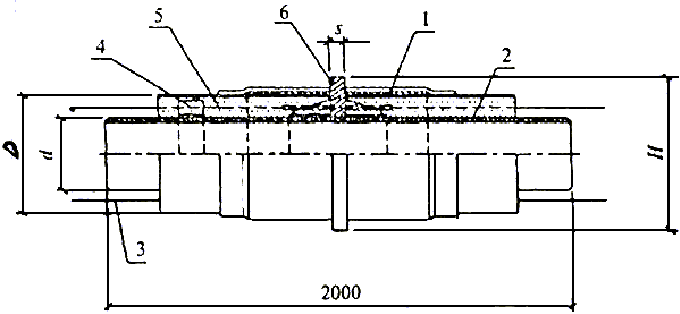 Рисунок В.10 - Элемент трубопровода с кабелем вывода: 1 - стальная труба; 2 - оболочка из полиэтилена; 3 - кабельный вывод; 4 - изоляция из пенополиуретана; 5 - центрирующая опора;6 - проводник-индикатор системы ОДК