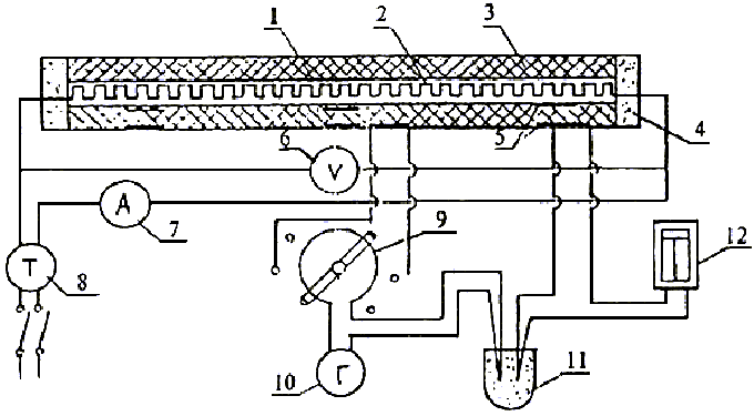 Рисунок Е.1: 1 - стальная труба; 2 - электронагреватель; 3 - испытуемый материал; 4 - изоляция; 5 - термопары; 6 - вольтметр; 7 - амперметр; 8 - автотрансформатор; 9 - переключатель; 10 - гальванометр;11 - сосуд со льдом; 12 - самопишущий гальванометр
