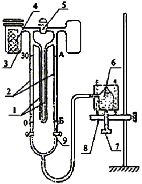 Рисунок Ж.1: 1 - манометр с дибутилфталатом; 2 - ртутный манометр; 3 - камера; 4 - образец; 5 - воздушный кран; 6 - колба с ртутью; 7 - винт; 8 - подставка; 9 - кран