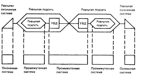 На рисунке 10а показаны две реальные подсети, взаимосвязанные без использования отдельных УВД. В данном случае одна из подсетей обеспечивает все элементы услуг сетевого уровня, и для работы с ней используется один протокол сетевого уровня. На рисунке 10b показаны две реальные подсети, взаимосвязанные через отдельное УВД, где опять-таки одна из подсетей обеспечивает все элементы услуг сетевого уровня. На рисунке 10с подсети, обеспечивающие все элементы УСУ, отсутствуют и, для работы с каждой участвующей подсетью используются различные протоколы сетевого уровня.