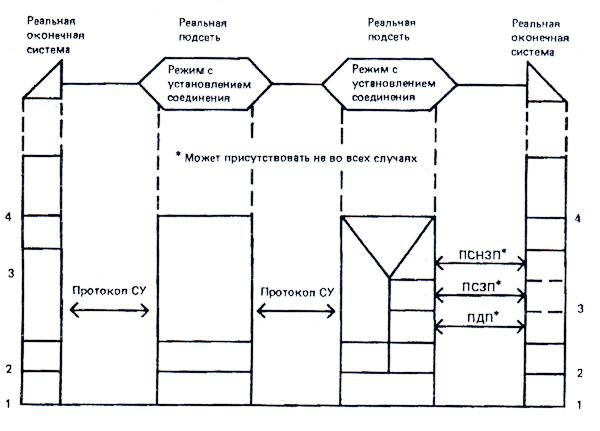 Метод постадийной гармонизации применим в комбинации таких реальных подсетей, из которых по меньшей мере одна не обеспечивает всех элементов услуг сетевого уровня. При использовании этого метода услуги каждой подсети, не поддерживающей всех элементов услуг сетевого уровня, "гармонизируются" таким образом, что они становятся идентичны услугам сетевого уровня ВОС. Дополнительные функции, необходимые для преобразования услуг подсети в услуги сетевого уровня ВОС, в общем случае могут выполнять маскирование некоторых особенностей услуг подсети, а также расширение или углубление этих услуг. Во многих случаях добавление таких функций гармонизации может потребовать работы одного или нескольких четко различных протоколов, выполняющих роль ПСНЗП и, возможно, выполнения роли ПСЗП над протоколами ПДП.