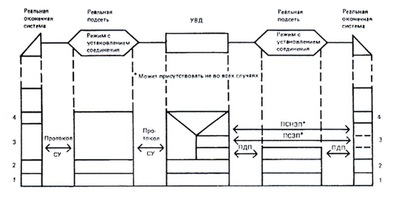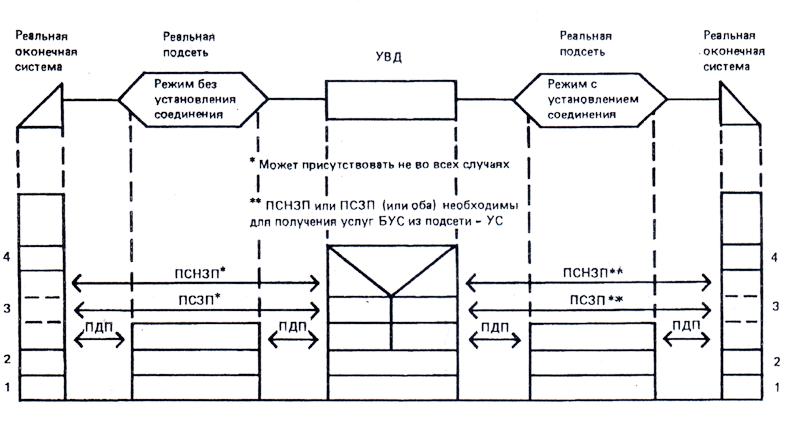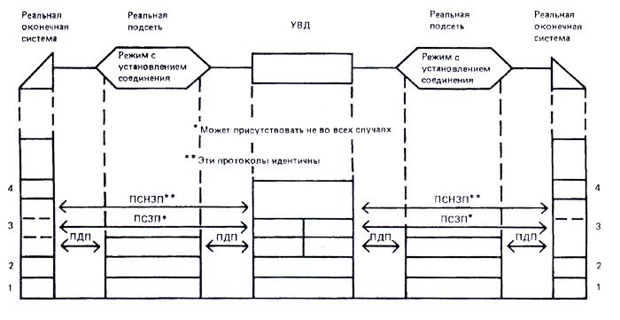 Цифры в таблице 2 означают конкретные комбинации тех протоколов, которые используются на сетевом уровне в конкретном случае обмена данными. При передаче данных в режиме с установлением соединения такие комбинации имеют место в течение всего времени существования соединения сетевого уровня между показанными на рисунке реальными оконечными системами. При обеспечении между реальными оконечными системами режима без установления соединения такие комбинации могут иметь место в любой момент выполнения передачи данных в таком режиме.
