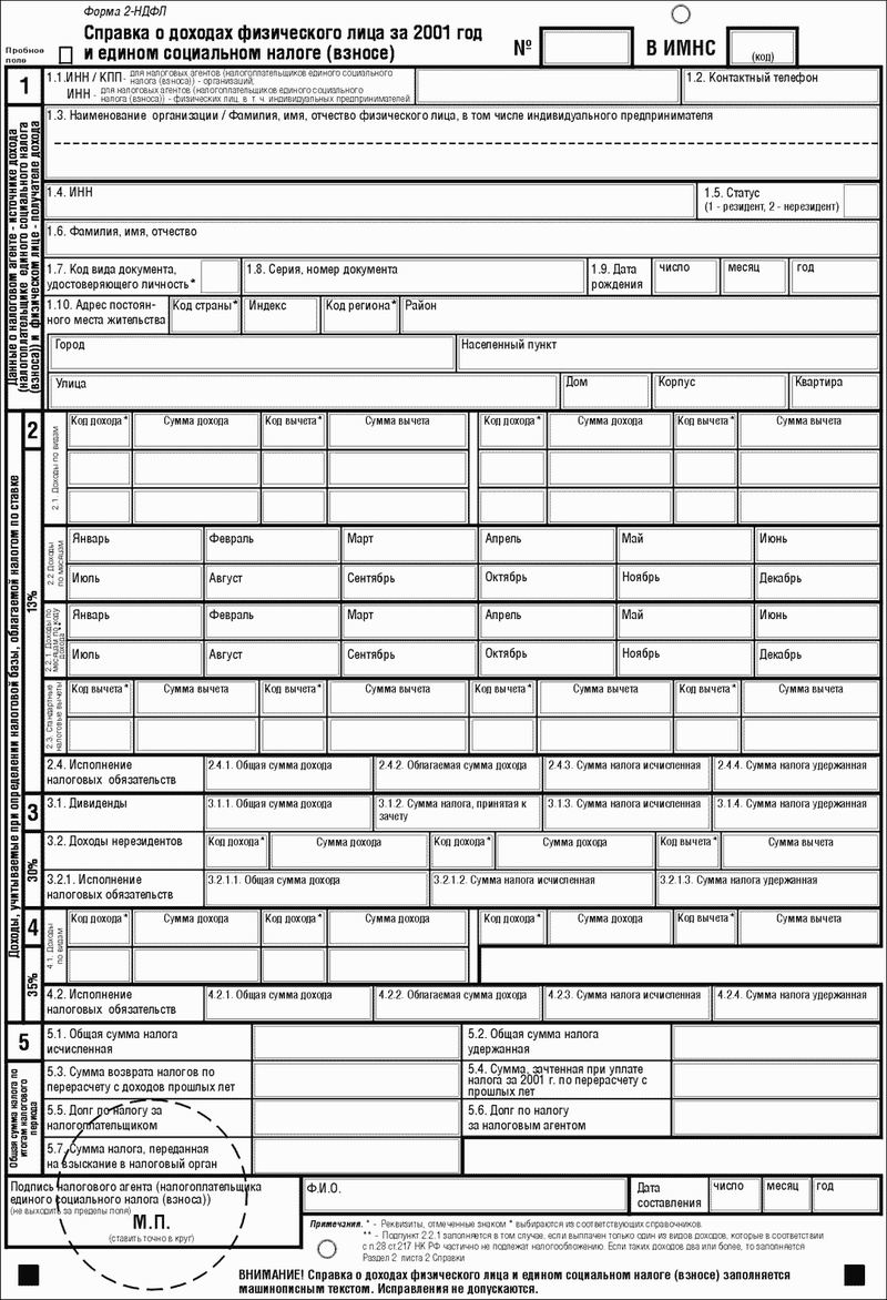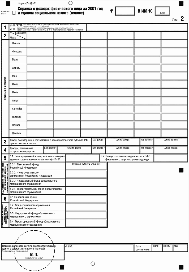 Сведения о доходах физических лиц и едином социальном налоге (взносе)) на бумажных носителях представляются налоговыми агентами (налогоплательщиками единого социального налога (взноса)) в налоговые органы по месту их постановки на налоговый учет по форме 2-НДФЛ (Справка о доходах физического лица за 2001 год и едином социальном налоге (взносе)).