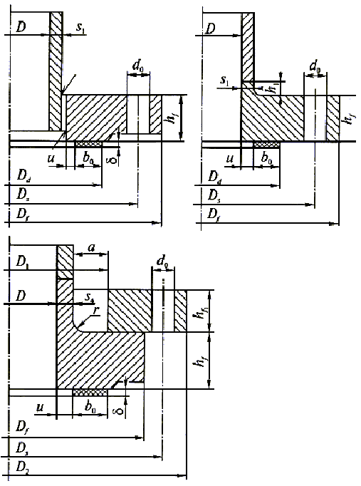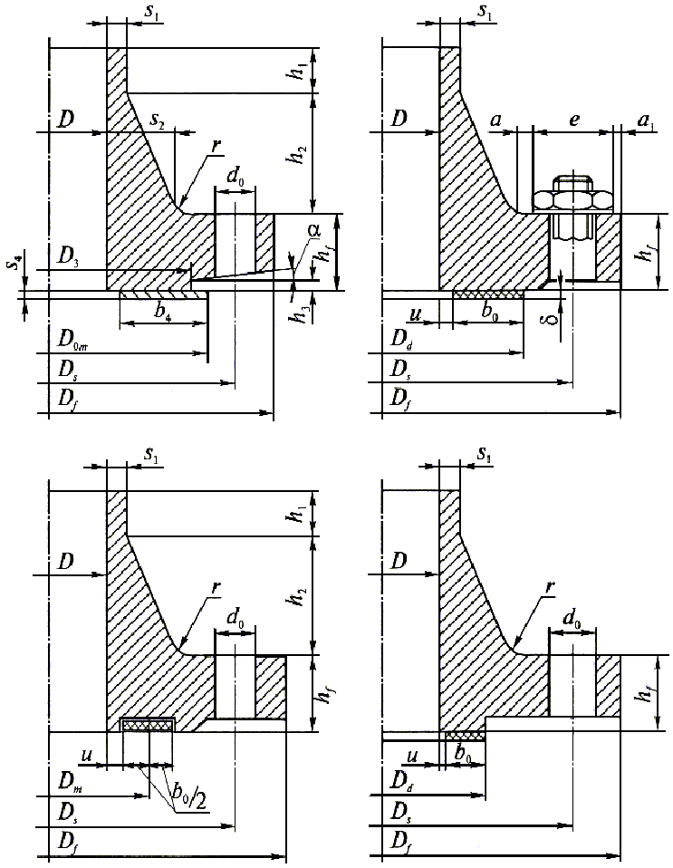 Если обеспечить выполнение условия 2hf =< Df - D - 2s1 не удается, то рекомендуется перейти на фланец с коническим переходом.