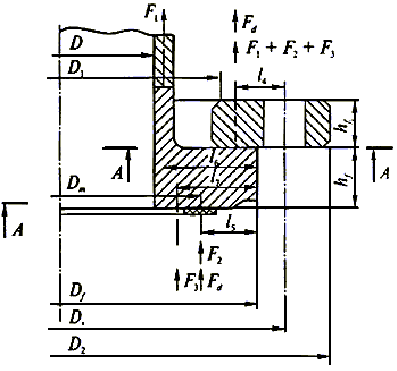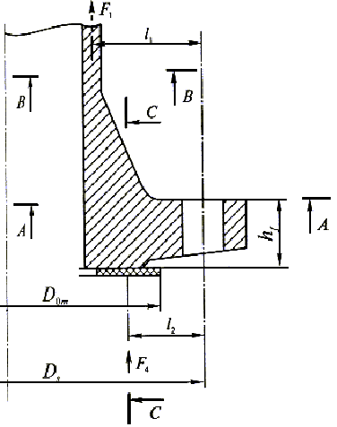 8.8.1.4. Изгибающие моменты Mh во фланцах, в нажимном кольце и опорном бурте от давления гидравлического испытания p_h, определяются по формулам п.8.8.1.3. При этом в формулах определения усилий F1, F2, F4 вместо расчетного давления p подставляется давление гидравлического испытания p_h, усилие F2 от расчетного давления заменяется на усилие F_2h от давления гидравлического испытания, определяемые согласно п.8.7.5.2.