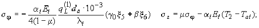 2.2. Окружные и осевые напряжения в прямолинейной трубе от действия одностороннего теплового потока T(r, ) определяются по формулам: