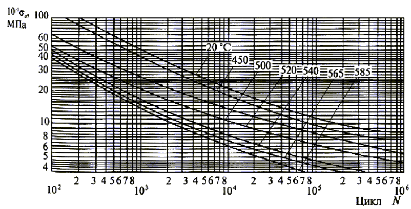5.1.5.6.2. Допускаемая амплитуда переменных напряжений [o_a] для заданного числа циклов N или допускаемое число циклов [N] для заданной амплитуды переменных напряжений o_a без учета влияния повреждения от ползучести определяются по кривым малоцикловой усталости, приведенным на графиках для максимальной температуры цикла (рис. 5.2, 5.3, 5.4).