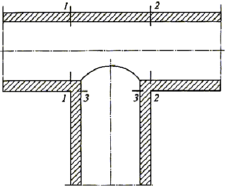 5.2.6.4.4. Для равнопроходного или почти равнопроходного тройникового узла (отношение большего наружного диаметра к меньшему не более 1,3) также производится расчет для сечений всех трех участков, сходящихся в тройниковом узле (рис. 5.12), по формуле