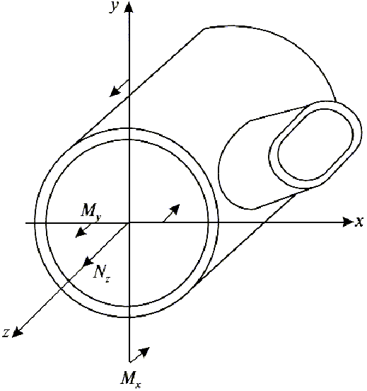 Изгибающий момент Mx действует в плоскости оси криволинейной трубы, а момент My - в плоскости, перпендикулярной к плоскости оси трубы (рис. 5.13). Момент Mx считается положительным, если направлен в сторону увеличения кривизны оси трубы.