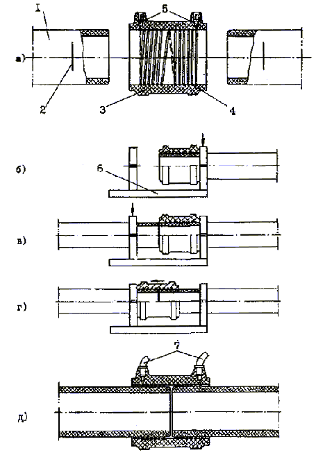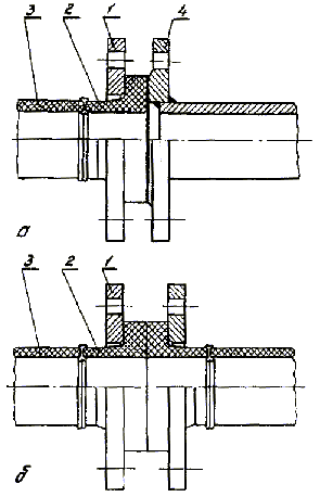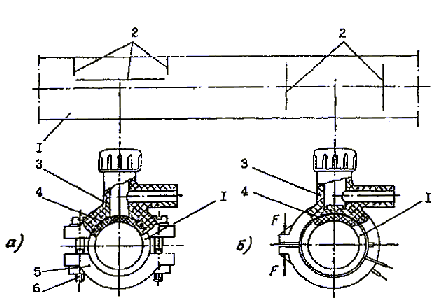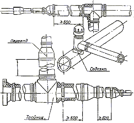 1 - втулка под фланец; 2 - тройник равнопроходный; 3 – переход; 4 - отвод 90° (угольник); 5 - муфта с закладным нагревателем; 6 - отвод седловой с закладным нагревателем (нижний полутомут не показан).
