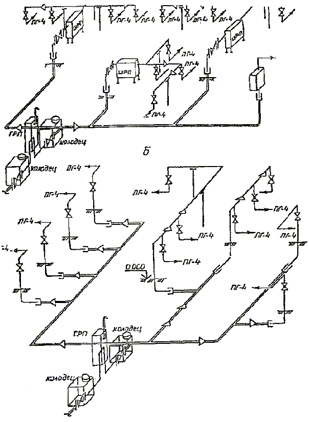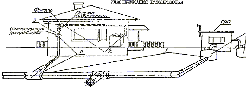 1 - распределительные газопроводы (наружные газопроводы, обеспечивающие подачу газа от источников газоснабжения до газопроводов-вводов, а также газопроводы среднего давлений, предназначенные для подачи газа к одному объекту: ГРП, котельной и т.п.);