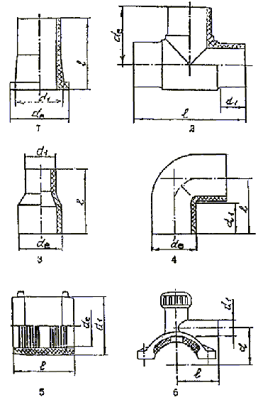 детали соединительные из ПЭ 63 (ПНД) (втулки под фланцы, отводы, тройники, переходы) диаметром от 63 до 225 мм, выпускаемые по ТУ 6-19-359-87;