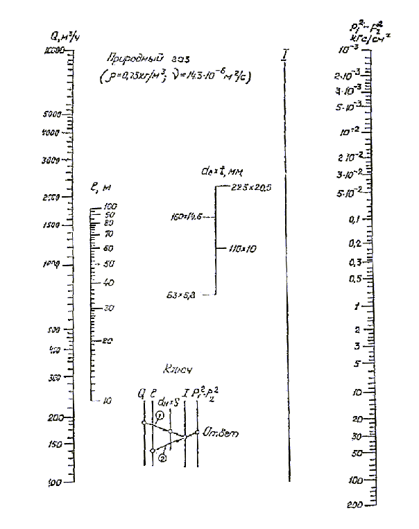 Принимаем по номограмме ближайший больший диаметр, он составляет 110 мм (di=90 мм). Затем по номограмме (рис. 1) определяем потери давления. Для этого через точку заданного расхода на шкале Q и точку полученного диаметра на шкале d_i проводим прямую до пересечения с осью I. Полученная точка на оси I соединяется с точкой заданной длины на оси l и прямая продолжается до пересечения с осью. Поскольку шкала l определяет длину газопровода от 10 до 100 м, уменьшаем для рассматриваемого примера длину газопровода в 100 раз (с 9500 до 95 м) и соответствующим увеличением полученного перепада давления тоже в 100 раз. В нашем примере значение 106 составит: