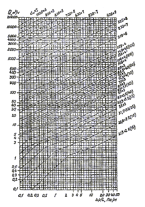 Рис. 2. Номограмма для определения потерь давления в стальных газопроводах низкого давления