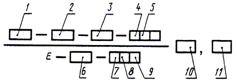 1 - тип; 2- марка; 3 - диаметр, мм; 4-обозначение назначения электродов; 5 - обозначение толщины покрытия; 6 - группа индексов, указывающих характеристики наплавленного металла и металла шва по ГОСТ 9467, ГОСТ 10051, или ГОСТ 10052; 7- обозначение вида покрытия; 8 - обозначение допустимых пространственных положений сварки или наплавки; 9 - обозначение рода применяемого при сварке или наплавке тока, полярности постоянного тока и номинального напряжения холостого хода источника питания сварочной дуги переменного тока частотой 50 Гц; 10 - обозначение настоящего стандарта; 11 - обозначение стандарта на типы электродов