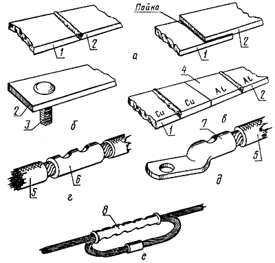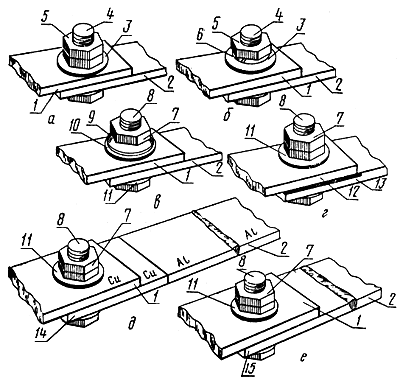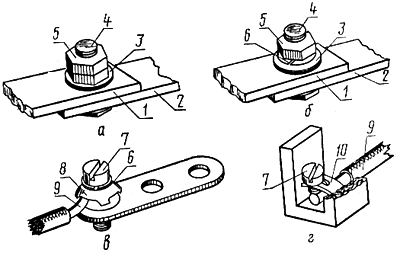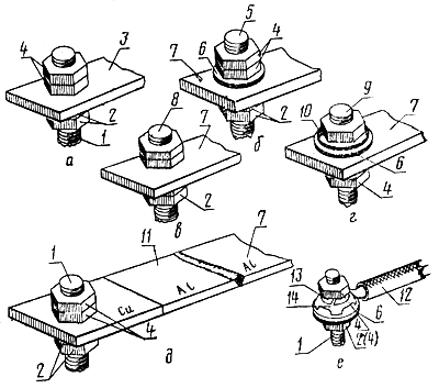а - проводник из меди, твердого алюминиевого сплава или алюминия с защитным металлическим покрытием рабочей поверхности; б, в, г - алюминиевый проводник; д - алюминиевый проводник через переходную медно-алюминиевую пластину; е - однопроволочная (многопроволочная) жила провода кабеля сеч. 10 мм2 с изгибанием в кольцо