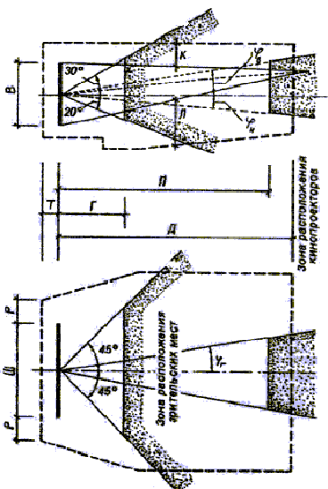 Места для зрителей в зрительных залах при кинодемонстрации рекомендуется проектировать в пределах зоны, изображенной на чертеже, где: