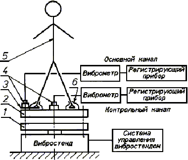 1 - стол вибростенда; 2 - платформа; 3 - измерительное приспособление (подпятник); 4 - измерительный вибропреобразователь; 5 - испытатель; 6 - испытываемая обувь