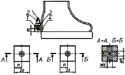 1 - кубик из дюралюминия (марки Д16Т по ГОСТ 21631-76); 2 - вибропреобразователь; 3 - шпилька крепления вибропреобразователя к кубику; 4 - винт с потайной головкой для крепления кубика к ботинку