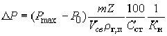 где P_max- максимальное давление взрыва стехиометрической газовоздушной или паровоздушной смеси в замкнутом объеме, определяемое экспериментально или по справочным данным в соответствии с требованиями п.3. При отсутствии данных допускается принимать P_max равным 900 кПа; P_0 - начальное давление, кПа (допускается принимать равным 101 кПа); m- масса горючего газа (ГГ) или паров легковоспламеняющихся (ЛВЖ) и горючих жидкостей (ГЖ), вышедших в результате расчетной аварии в помещение, вычисляемая для ГГ по формуле (6), а для паров ЛВЖ и ГЖ по формуле (11), кг; Z - коэффициент участия горючего во взрыве, который может быть рассчитан на основе характера распределения газов и паров в объеме помещения согласно приложению. Допускается принимать значение Z по табл.2; V_св - свободный объем помещения, м3; ро_г,п - плотность газа или пара при расчетной температуре t_p, кг·м(-3), вычисляемая по формуле