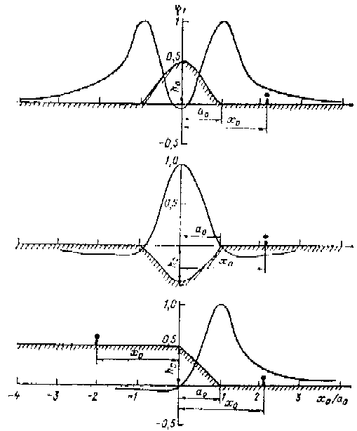 где _m определяется по табл. 4.1 в зависимости от форм рельефа, сечения которых представлены на рис. 4.1, и безразмерных величин n_1 = H/h_0, и n_2 = a_0/h_0 (n_1 определяется с точность до десятых, а n_2- с точностью до целых). Здесь H - высота источника, h_0 - высота (глубина) препятствия, a_0 - полуширина гряды (холма), ложбины или протяженность бокового склона уступа, x_0 -расстояние от середины препятствия в случае гряды или ложбины и от верхней кромки склона в случае уступа до источника, как указано на рис. 4.1. Значение функции _1 определяется в зависимости от отношения |x_0|/a_0 по графикам (см. рис. 4.1), соответствующим различным формам рельефа. Если источник расположен на верхнем плато уступа, в качестве аргумента функции j_1 вместо |x_0|/a_0 принимается (–x_0/a_0).