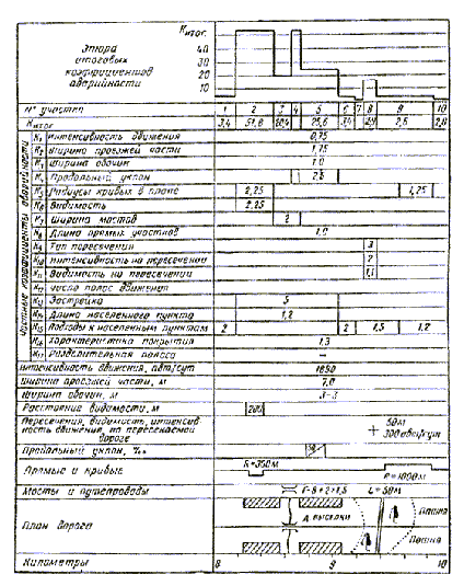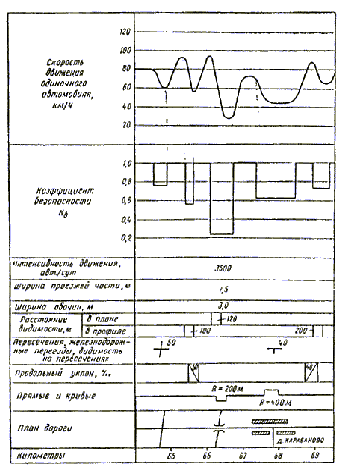 1.2.1. Для оценки соответствия размеров отдельных элементов дороги и их сочетаний требованиям безопасности и удобства движения на основе расчетов на ЭВМ или по вспомогательным таблицам строят эпюру изменения скорости одиночного автомобиля в зависимости от параметров продольного профиля и плана без учета ограничений, предусматриваемых Правилами дорожного движения и устанавливаемыми знаками.