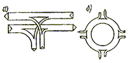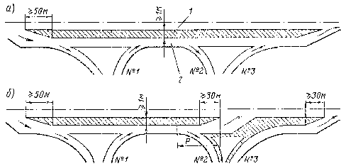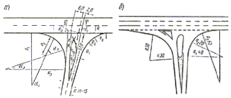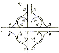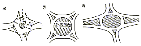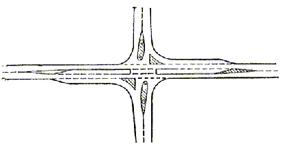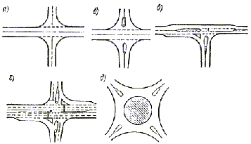 г) устройством пересечений с другими дорогами (автомобильными и железными), отвечающих требованиям пропуска интенсивных потоков автомобилей (канализированные пересечения, транспортные развязки в разных уровнях);