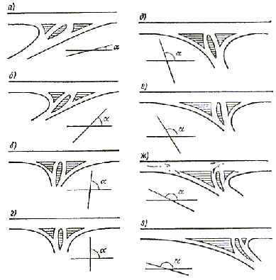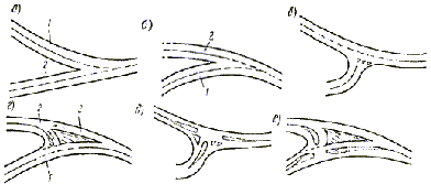 е) слияния или перекрещивания транспортных потоков на пересечениях дорог, съездах, примыканиях, переходно-скоростных полосах;