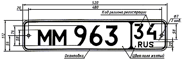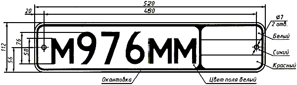 3.5 Основные размеры регистрационных знаков, расположение надписей "RUS" и "ТРАНЗИТ", цифр, букв и окантовки на лицевой стороне регистрационных знаков, размеры и расположение отверстий для крепления регистрационного знака на транспортном средстве должны соответствовать указанным на рисунках А.1-А.22 приложения А. В случае наличия на знаках типов 1, 1Б и 2 изображения Государственного флага Российской Федерации надпись "RUS" размещается в соответствии с рисунком А.23 приложения А.