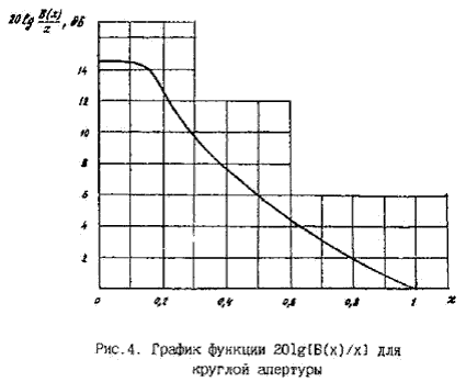 4.11. Функция F(u, x) рассчитывалась апертурным методом - численным интегрированием полей элементарных излучателей (элементов Гюйгенса), расположенных по всей апертуре. В случае круглой апертуры учитывалось затенение апертуры облучателем. Учет затенения осуществлялся исключением интегрирования полей элементов Гюйгенса, расположенных в центре апертуры внутри круга с диаметром dт. В методике принято, что коэффициент затенения dт/d = 0,1 (dт - диаметр "теневого диска", d - диаметр апертуры).