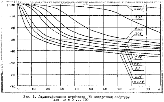 Аналогичные кривые для антенн с квадратной апертурой приведены на рис. 8 и рис. 9.