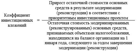 в соответствии с пунктом 4 части 1 статьи 5 закона области N 3046-ОЗ - в отношении признаваемых объектами налогообложения основных средств, находящихся на балансе организации, по которым согласно инвестиционному соглашению осуществлена модернизация (реконструкция) с коэффициентом инвестиционных вложений от 0,3 до 0,6. (в ред. Закона Вологодской области от 26.10.2018 N 4422-ОЗ)