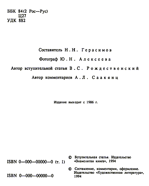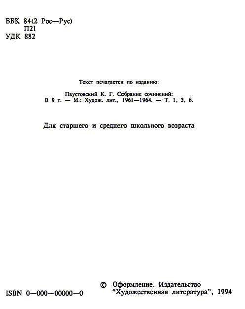 4.1.1 Выходные сведения книжных изданий включают: сведения об авторах и других лицах, участвовавших в создании издания; заглавие издания; надзаголовочные данные; подзаголовочные данные; выходные данные; выпускные данные; сведения о перепечатке; классификационные индексы; авторский знак; международные стандартные номера книг и штрих-коды; знак охраны авторского права.